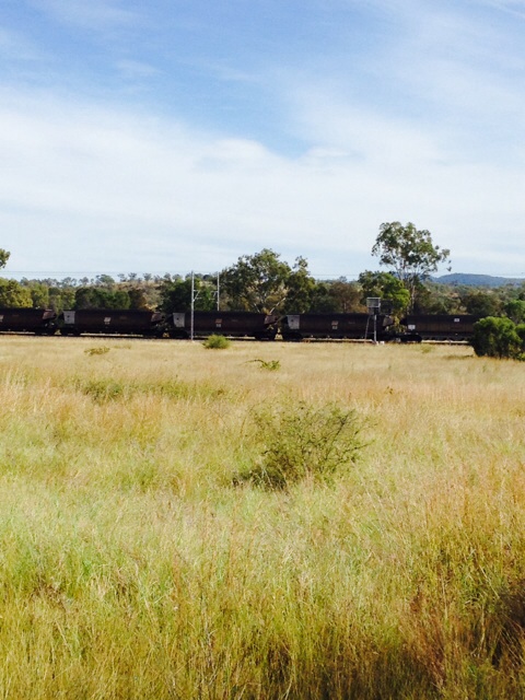The last 50kms into Rockhampton were quite challenging, with strong cross winds, little or no shoulder, with road trains that come ever so close. I really needed to hold my nerve and concentration. I caught glimpses through the trees of a railway line that runs almost parallel to the road in places. It’s reminiscent of a Jeffery Smart painting. However, instead of colored box-like containers, this one carried grain to the harbor and a hungry world.