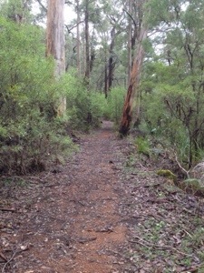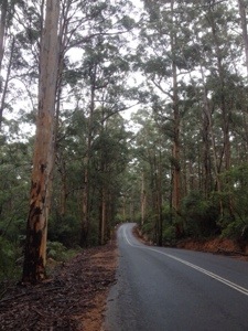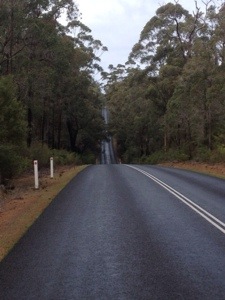 Evidently, the weather is clearing. There’s water everywhere and when I closed my eyes on the edge of the forest, I could hear running water in rivulets and the trees dripping teardrops. I’m cycling amid the Great Southern Forests of Karri and Jarrah trees. These are similar conditions to the Otway region of Victoria. Dairy, logging, rain, steep hills and equally steep descents.