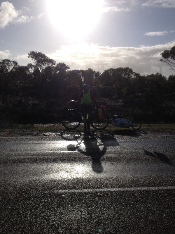 In places, the roadside verge was nonexistent today, not that that deters the road trains who give a cyclist no quarter. Still, I kept focused on the changing weather/road conditions: With my mind on Esperence with those seaside views. Stopping for a “Nature Break” I absentmindedly stood on top of a bull ant nest. I didn’t realise until they began biting my ankles and I managed a speedy exit with my dignity intact. It could have been worse!
