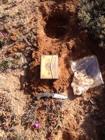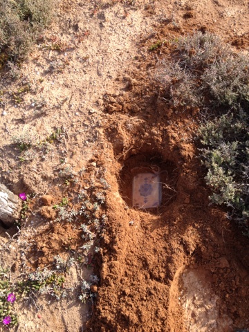 Purple pig face was in bloom around the base of the fence posts, things didn’t look promising. I started digging with my knife on the north side of the northernmost post about six inches down I struck pay dirt; I couldn’t believe it!
