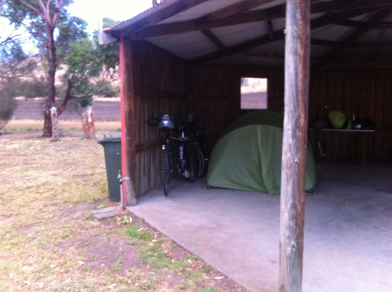 Rolling into Richmond last night the fearsome South Westerly was already building, 55 kilometres an hour was predicted with the occasional stronger gusts. Down at the caravan park we pitched our tent on the concrete slab of a disused camp kitchen. It had no windows, just a roof and walls, it was a fantastic buffer against the howling tempest. Gum Nuts and branches pelted the roof like hailstones all night but we remained safe and sound.