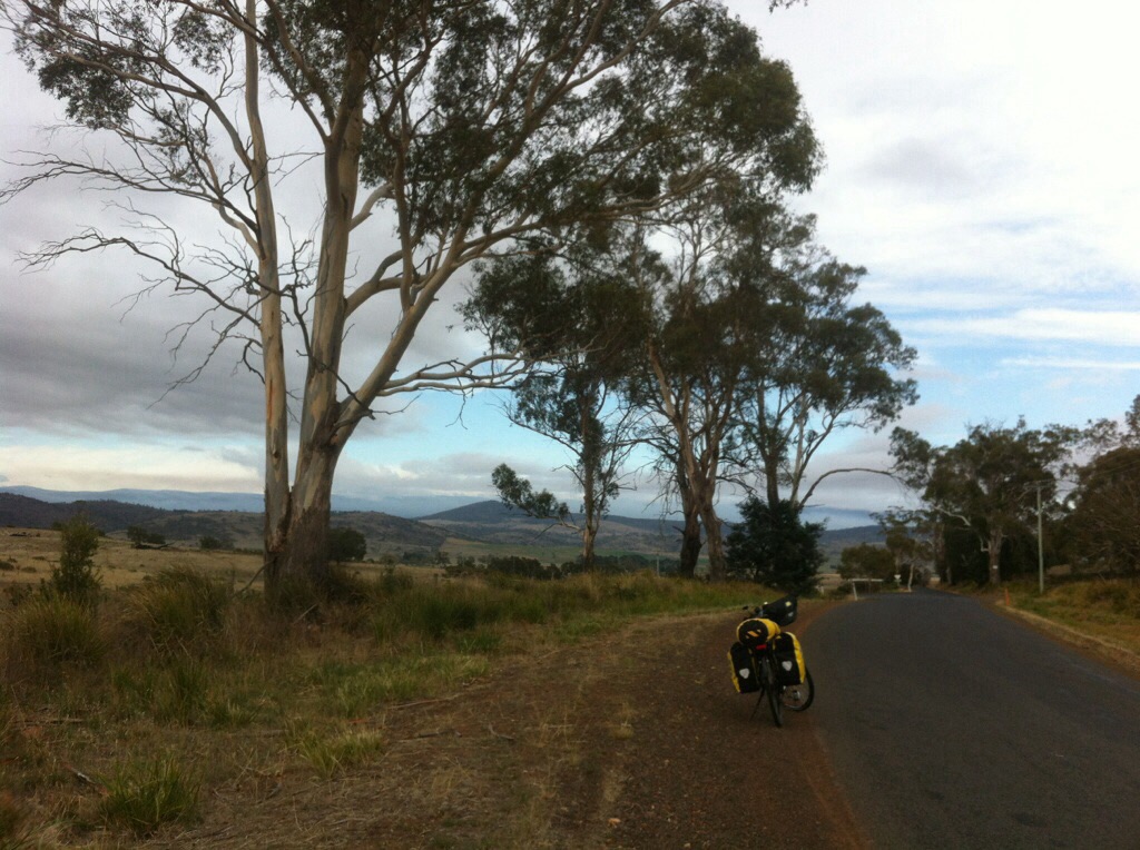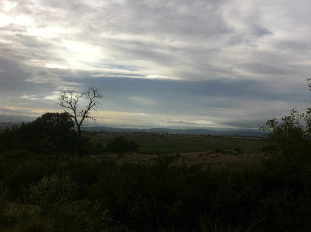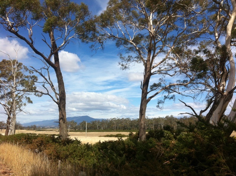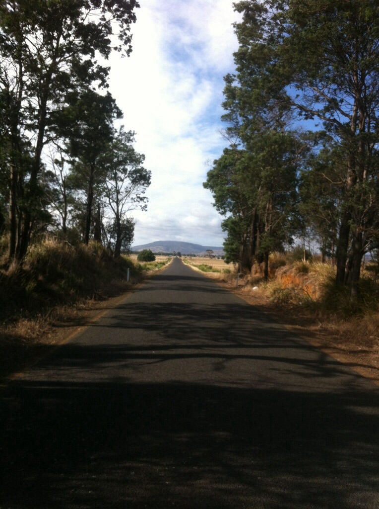 The Great Western Tiers on our left provided a spectacular backdrop, we watched as the shadows of the cumulus clouds dotted the range. This is an old farming country. We passed many colonial-era properties still in operation. Sheep always run at our approach. I called out to one “mint sauce”, which stopped him in his tracks as if he knew his destiny.