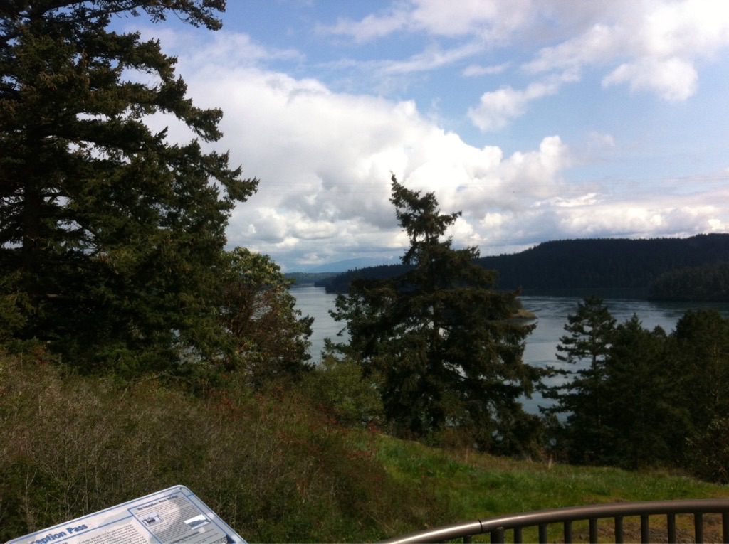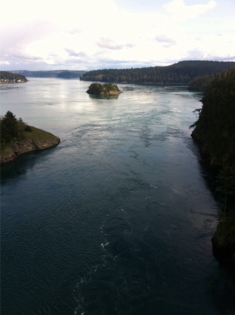 Continuing our island hopping, we took the Washington State Ferry from Lopez Island to Anacortes on Fidalgo Island. The day’s order was for a long series of steeply rolling hills through some beautiful forested country of lakes, firs, cedars, and moss-covered maples. The highlight was crossing the bridge at Deception Pass over to Whidbey Island. I suffered from vertigo looking down into the swirling chasm below; beautiful & dangerous.