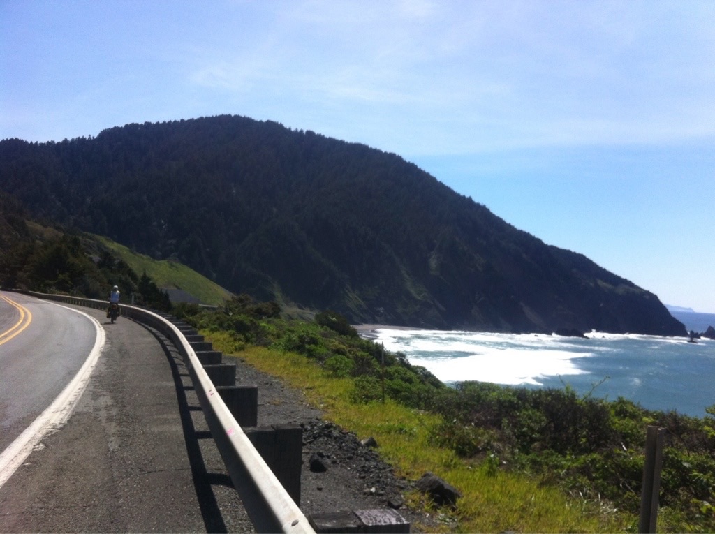 Under clear skies, we cycled the coast with a building tailwind. The road is carved into a steep hillside around Humbug Mountain. Breathtaking views and exhilarating descents. Rock falls are common along this stretch of Highway 101 signs warn of slide areas and the surface is rough in parts.