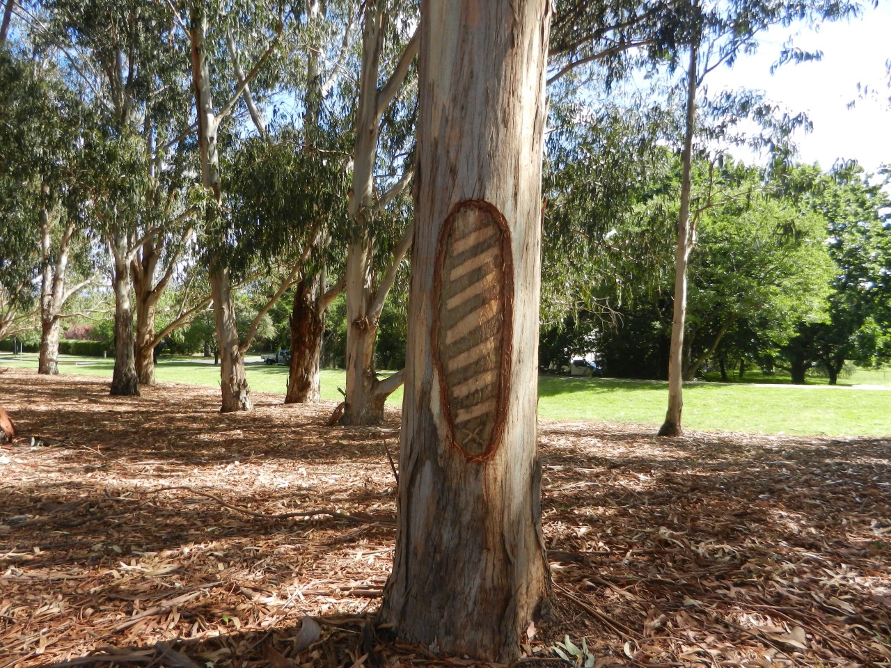 Victorian Blue Eucalyptus line ANZAC Avenue, their long tapered leaves appear as teardrops. One tree bears the indigenous carving marks of a sacred place.