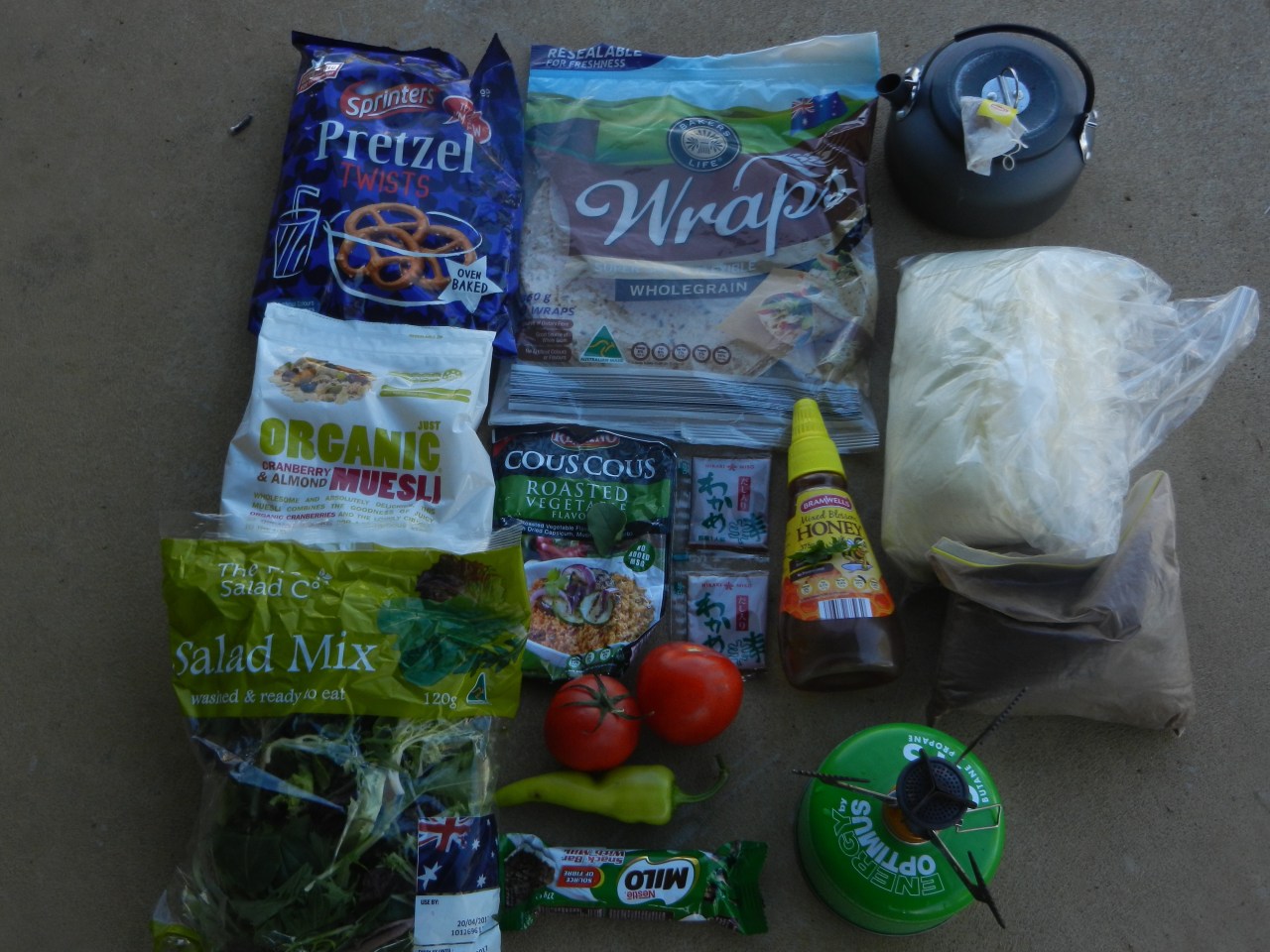 Without a fridge or an oven, we rely on our trusty pocket rocket gas stove. Mostly shopping daily, haunting the ‘specials’ stand but keeping a little tinned emergency food and dry biscuits just in case. Lunch is often wholemeal wraps with salad, tomato, with a dip, usually tzatziki or hummus.
