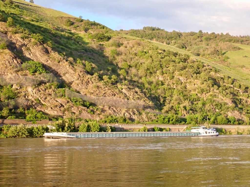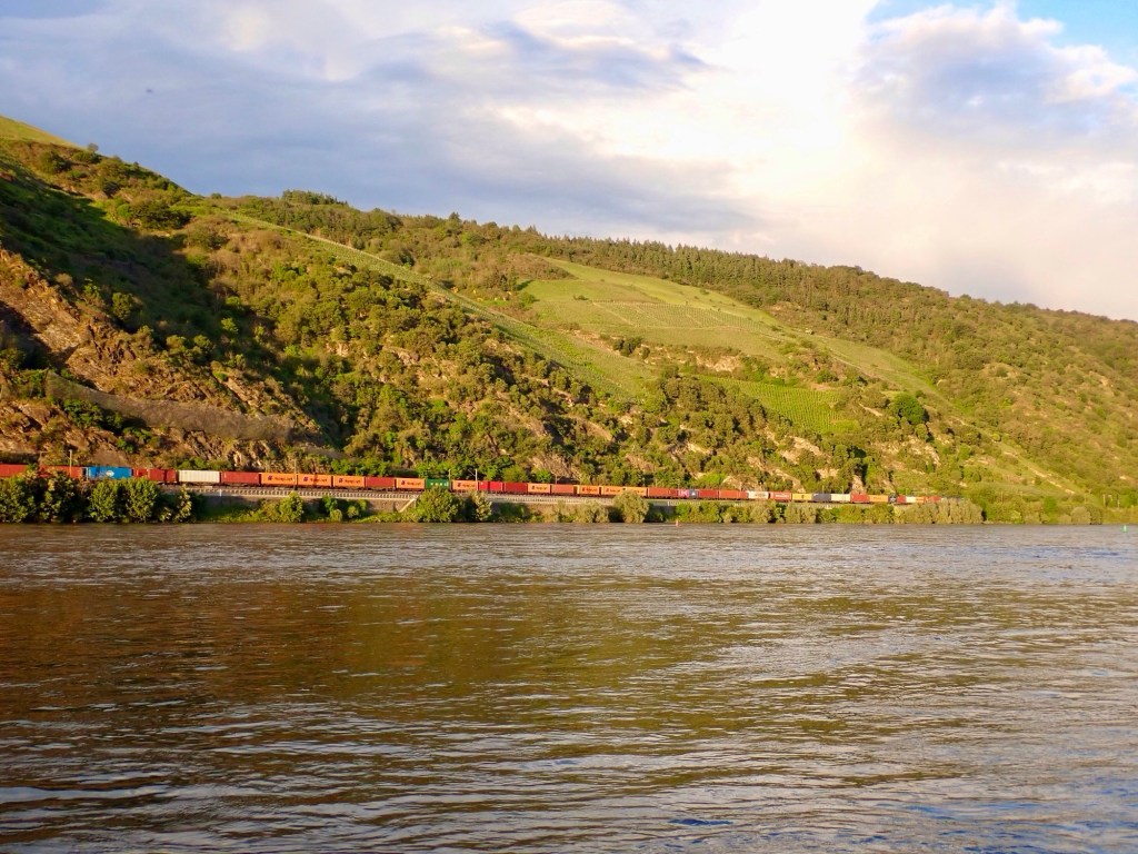 At Oberwesel Camping they still had our details on file from when we camped here years ago. Down at the rivers edge where we camped, below the towering cliffs, the river echos, booming across the landscape. On the far eastern side of the river, below the escarpment, goods trains roar past looking like the Australian painter Jeffery Smart’s painting “Container train in the Landscape” has come bursting into life.